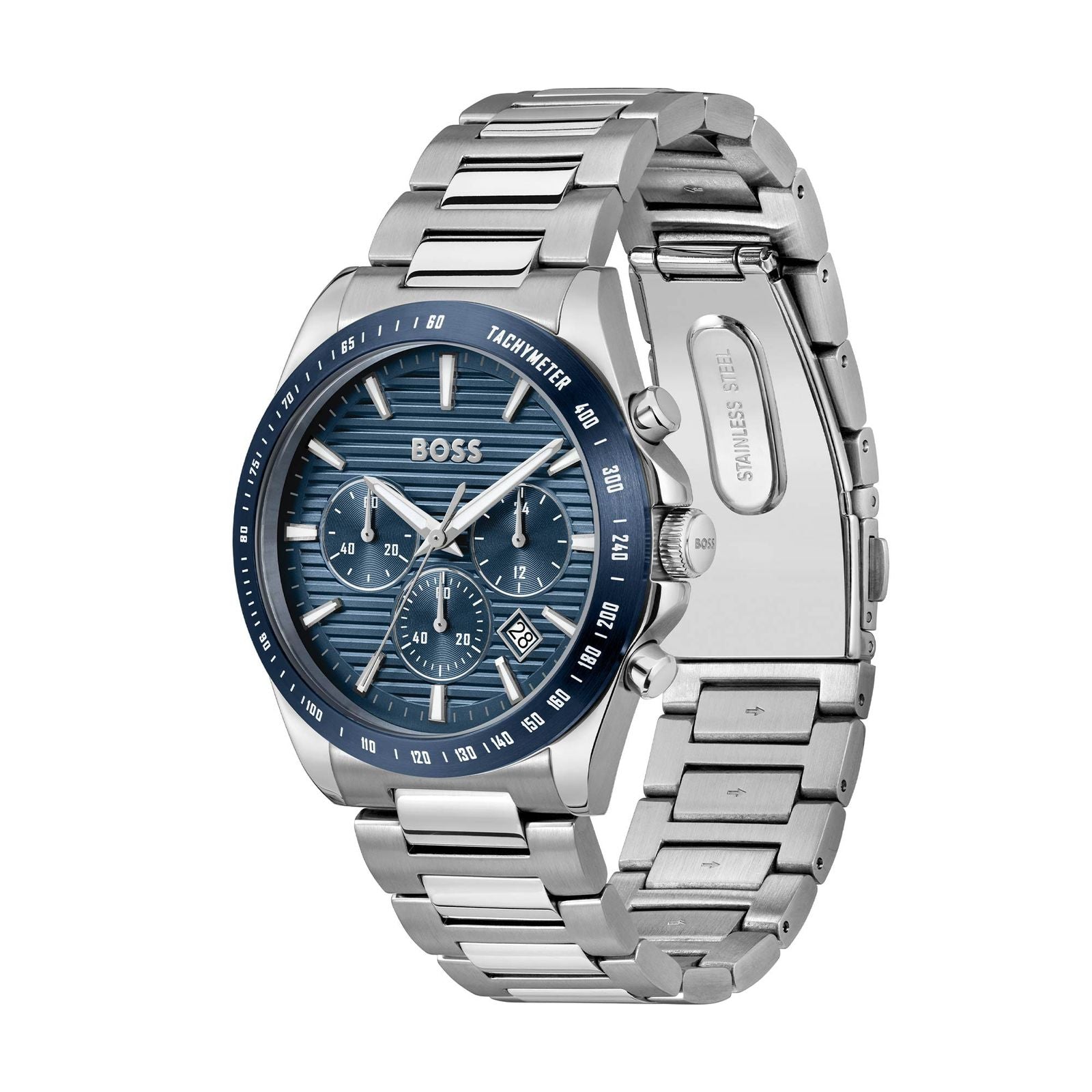 - BOSS Men's Strike with a stainless steel case, blue dial, and a silver bracelet.